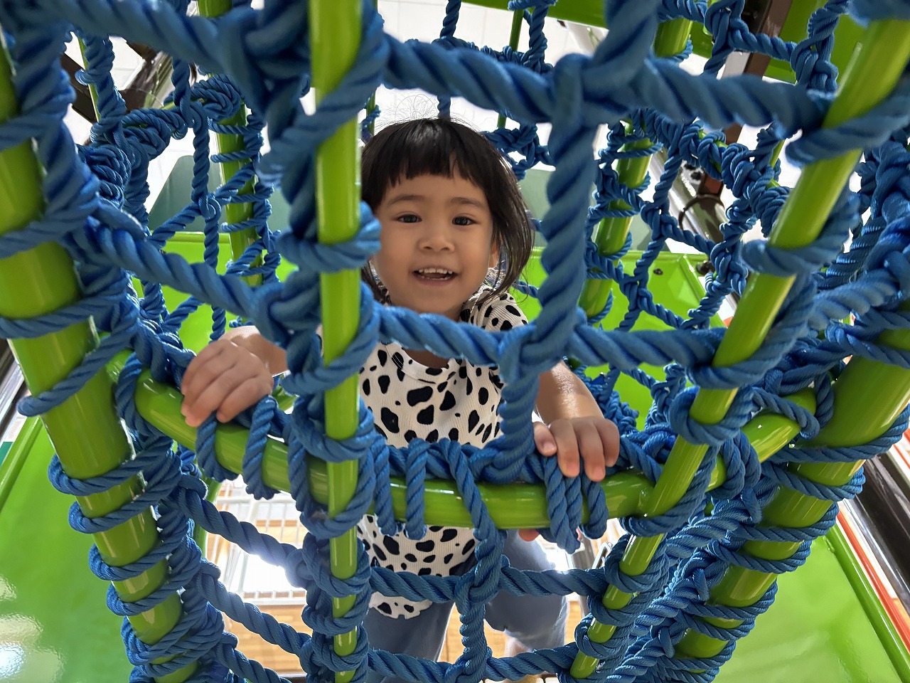 ネットフロアでは、上まで登って網のすき間から顔を出したり、スライダーの滑り台を何度も滑ったり・・・