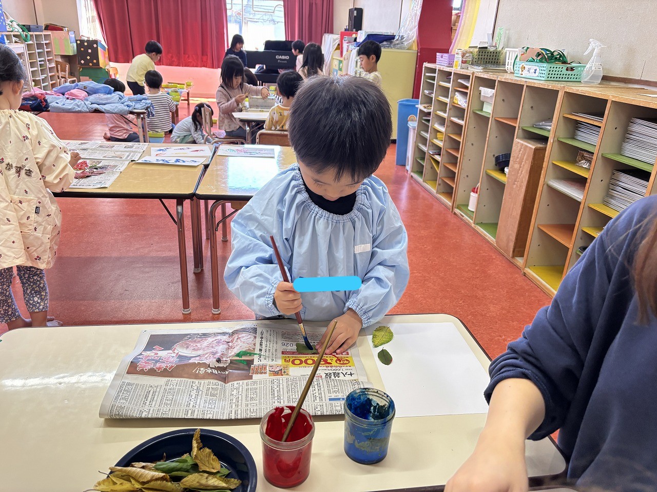 葉っぱに絵の具を付け、画用紙に乗せて、、、新聞紙を重ねてくるくるこすると葉っぱの模様が浮き出ててきます。
