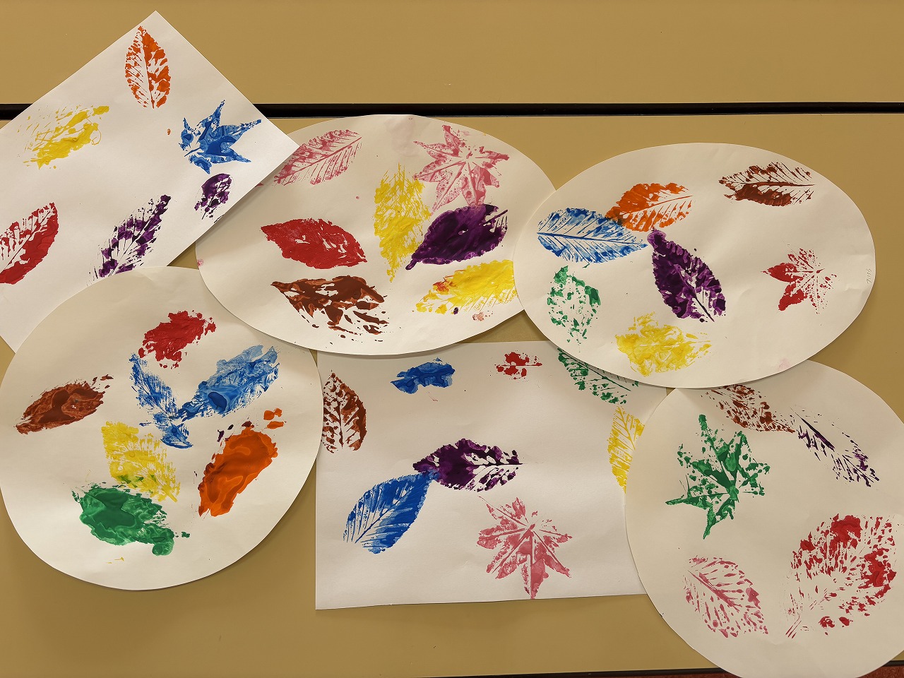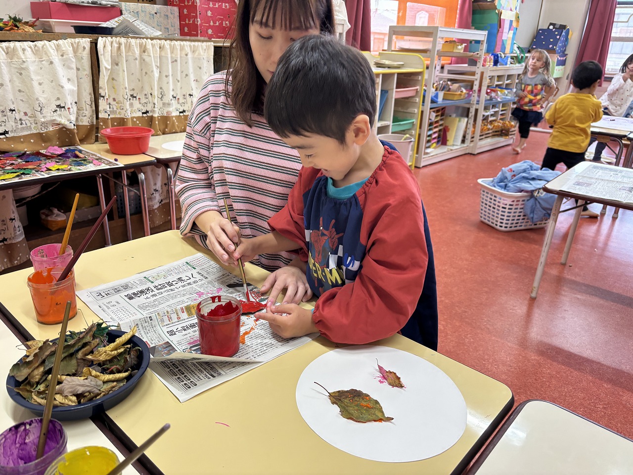 幼稚園の園庭で取れた葉っぱを使ってスタンピング!