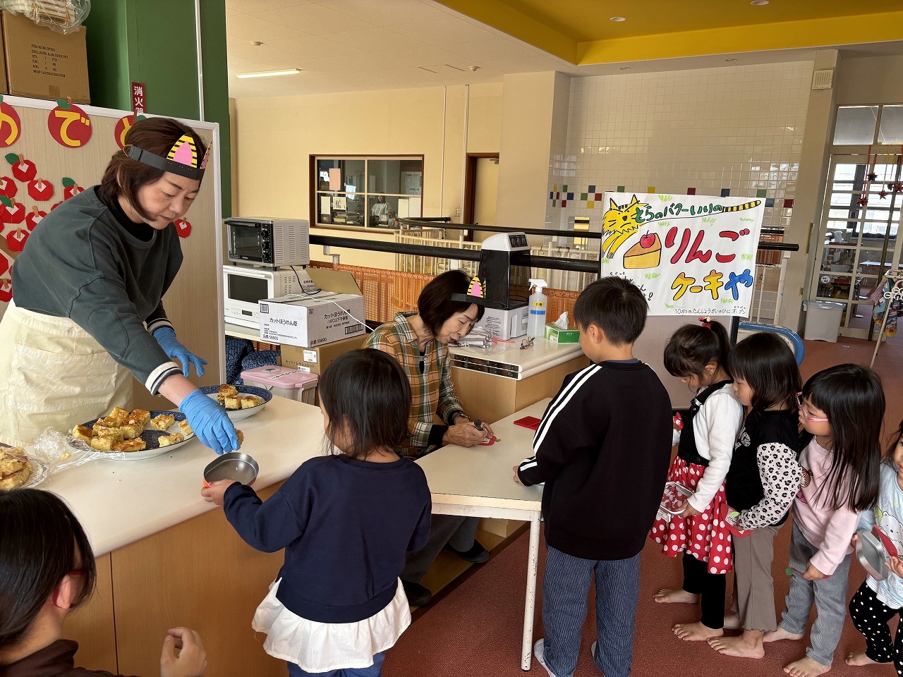 前日に配布されたチケットを持って、ケーキ屋さんからりんごケーキをもらいました。